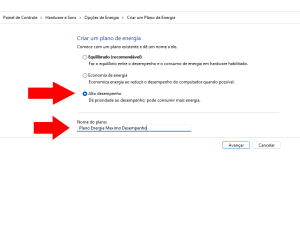 Passo 03: Na lateral esquerda tem a opção “Criar um plano de energia” clique nela que vai abrir uma seção onde podemos escolher o tipo de plano de energia que desejamos criar, selecione a última opção que é “Alto Desempenho” em seguida dê um nome ao plano conforme mostra a imagem abaixo.